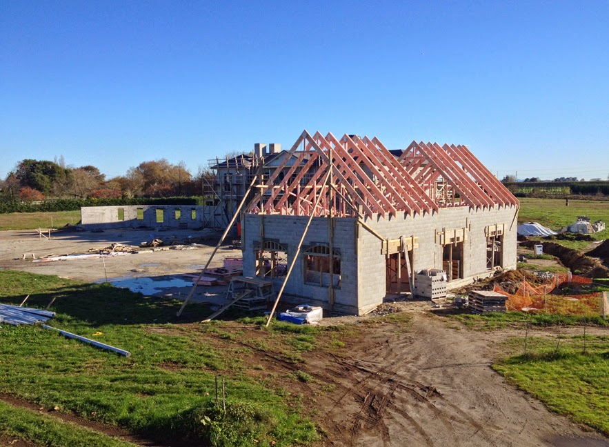 After a couple of weeks off for Christmas, the builders have got straight back into the build. This week the trusses went up, ready for the slate roof to go on in a fortnight. We were originally going to have a 'slate-look' pressed steel roof, but our builders have managed to source some real slates, so it will now look even more authentic.